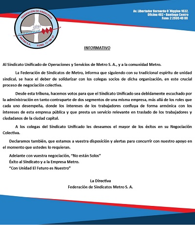 COMUNICADO FEDERACION DE SINDICATOS DE METRO